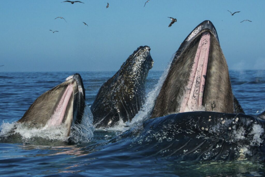 From the surface you would not be able to see Cordell Bank, because its highest point is at a depth of about 115 feet underwater. However, at the surface, other signs of marine life are present. . Humpback, blue, and fin whales feed on krill and fish in the productive waters of CBNMS during their annual migrations. In addition to migratory species, resident species of dolphins, seals, and sea lions frequent the sanctuary more regularly throughout the year to feed. CBNMS also supports more than 75 species of seabirds, which can be seen resting at the surface or diving for fish and pelagic invertebrates. Similarly, ocean sunfish and leatherback sea turtles feast on gelatinous pelagic invertebrates including jellyfish and ctenophores within the sanctuary’s waters.